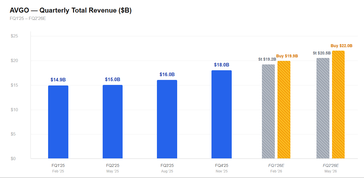 1-2 (or 3) liner: AVGO stock down 10% YTD (and dn 11% since last print despite estimates going up 20%+) as fears around 1) Mediatek share loss concerns at GOOGL (bulls will argue MTK SerDes not competitive with AVGO) 2) software exposure/headwinds and 3) margin sustainability given Anthropic revs tied to racks (near-term) and fears around COT implementations (long-term). Hock has sounded good intra around demand and addressing some of these issues. Keys for the call/print are the Q2 guide which bulls think comes above, Hock’s commentary around EBITDA margins (does he confirm mid 60s for the year) or give visibility around trough margins, and any commentary around backlog visibility beyond $100B. Question I hear from fast money guys emblematic of sentiment: if NVDA can’t go up after a big guide w GTC as a catalyst, can AVGO work?