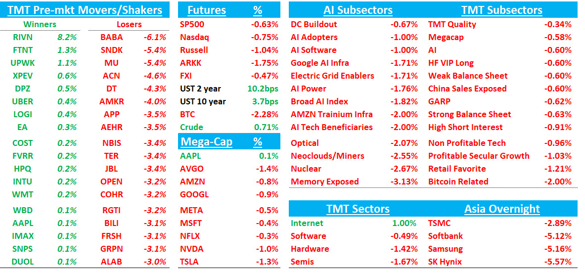 Asia was largely red overnight: TPX -2.91%, NKY -3.38%, Hang Seng -2.02%, HSCEI -1.58%, SHCOMP -1.39%, Shenzhen -2.27%, Taiwan TAIEX -1.92%, Korea KOSPI -2.73. Memory names down following MU: Samsung/SK Hynix -5%