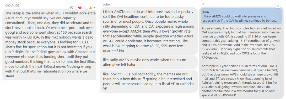 AMZN -1% continues to underperform as investors sit on their hands waiting for evidence of the ever elusive AWS accel. Some good back and forth in TMTB chat here: