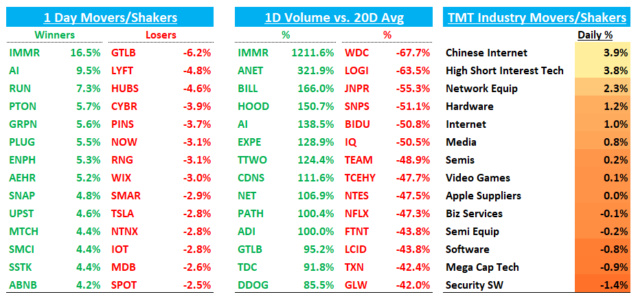 Good afternoon. QQQs finished down 40bps while ARKK +2.2%/IWM +1.8% outperformed. BTC +4% getting close to $50k (a potential sign of continued risk on in smaller names). An unwindy factor day with Mega Cap down 1% and high shorted stocks up close to 4% as software underperformed post a strong performance last week. Some tea leaves such as U and TTD up on early morning bad news tells us this trend might continue to have legs.