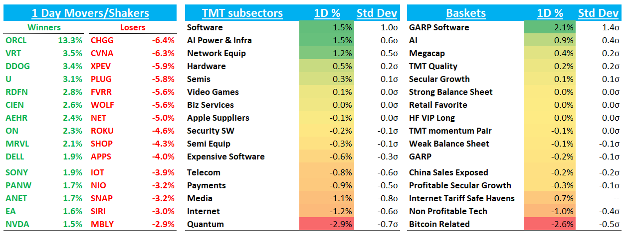 NVDA +1.5% continues to act great and not far away from new ATHs, helped by ORCL’s great print and demand commentary + positive recaps from GTC Paris from the sell-side
