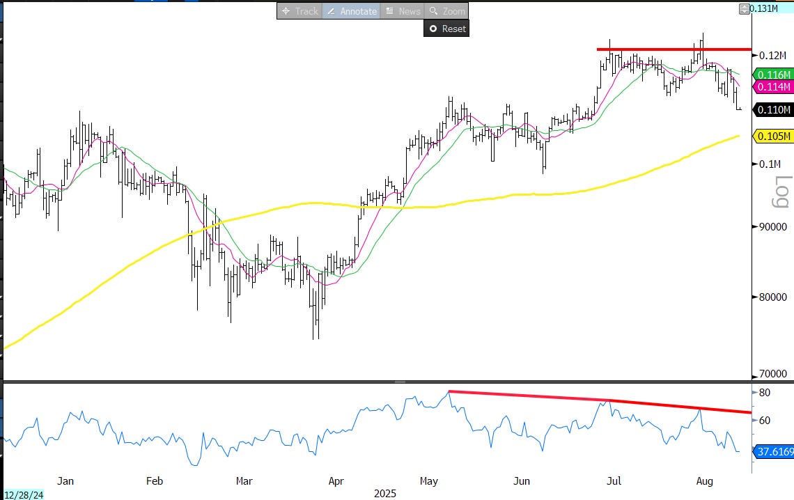 QQQs - 30bps with a mini late day swoon. Bulls were hoping for more follow through today post-Powell on Friday but it turned out to be a pretty sleepy August Monday. Momentum outperformed non profitable tech by 160bps. Yields rose 2-3bps across the curve. BTC -2% continues to slip following its false breakout earlier this month: