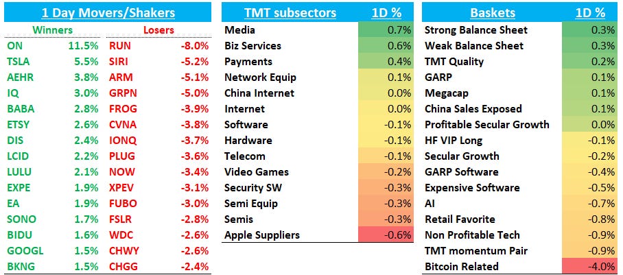 Good afternoon. QQQs +16bps as both non-profitable tech and TMT Momentum trade led the way lower. Yields ticked down slightly; BTC - 1%; IWM -1.11% with first day of underperformance vs QQQs in a while ahead of a big week of earnings. Reminder, Jensen and Zuck fireside chat tonight at 6pm est.