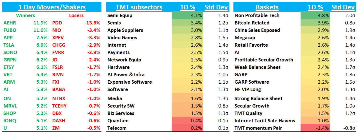 Good afternoon. Risk on continues as QQQs +2.4% with strength across the board led by semis +3.4%. Long end fell 6-9 bps across the curve as reduced long-end JGB issuance caused some to speculate there would be more demand for long-end treasuries. One of the strongest parts of the bearish market narrative was that yields were spiking so this was added fuel to the bull narrative, which had already gained strength last week as the admin said they were going to run the economy hot instead of trying to cut the deficit. Some dovish data also helped move yields lower. The market continues to price in 50bps worth of cuts.