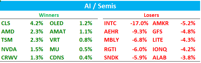 INTC -17% back to $45: as we said this morning, didn’t hear many bulls wanting to jump ship given demand signals and likely trough GMs in Q1, but also didn’t hear many wanting to jump in above $45. We wrote up the bull vs. bear debate in this morning’s wrap