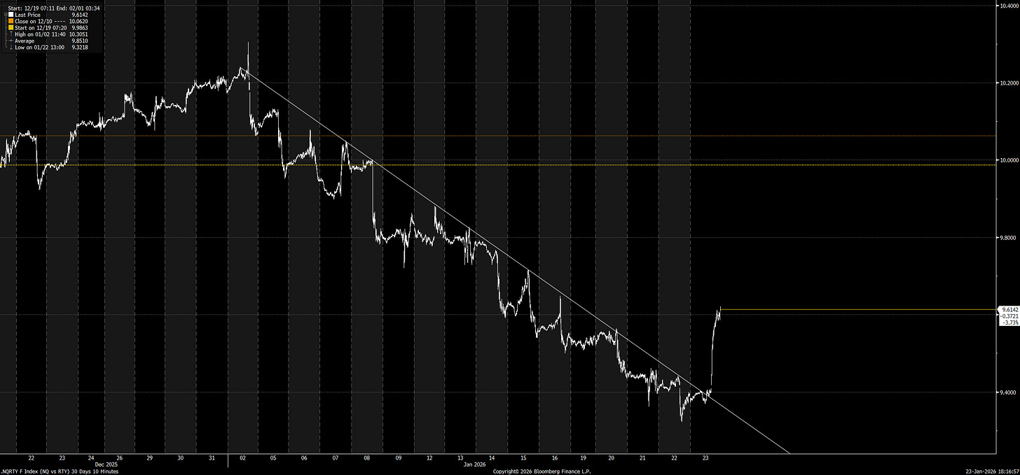 Good afternoon. QQQs +32bps as large cap caught a bid (AMZN/MTEA +2%; MSFT +3%, NVDA +1.5%) helping the Nasdaq end its 14 day losing streak vs. the Russel. Here’s the NQ vs. RTY: