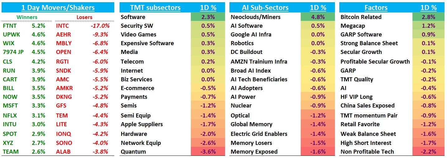 Software (+2.3%) continues to trade well for the 2nd straight day (MSFT +3% and NOW +3% finally caught bids). That ,security, and internet were green, while semis (-1.2%), semi equipment, network gear, and hardware lagged meaningfully although names like AMD, CLS, NVDA and TSM were up. On the factor side, bitcoin-related names and megacap outperformed. Riskier cohorts like non-profitable tech, high short interest, retail favorites sold off. Outsde of Tech, Oil rose 300bps, JPY spiked 165bps vs USD and US nat gas rose 5-6% on the bit storm expectations across the U.S.