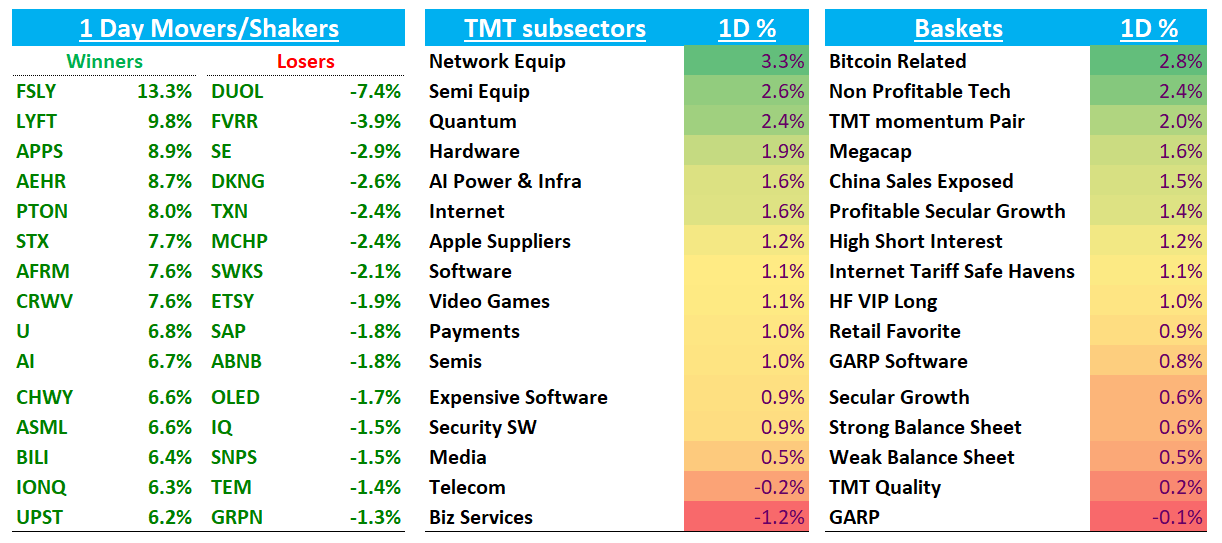 - AMZN +1.4% as Cowen was out saying that: after pulling back on colocation leasing, which we highlighted in our April channel checks, our recent checks confirm that Amazon has returned to the colocation market....says Project Raimer could be 7GW expansion, with close to 2GW coming online by EOY '26…another datapoint that helps support the AWS accel thesis in 2026