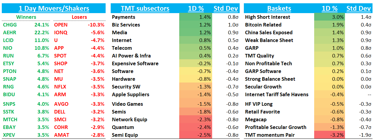 ETSY +5.5% as RJ hiked PT to $70 on improving demand trends calling out improving web traffic, app usage and search trends to end the Q. DB also called out an overall strong Q2 and expects ETSY to guide to slight GMS improvement in Q3 as the platform benefits from more organic app-driven engagement and retooled product focus. This follows MS’ upgrade yesterday. 3p data continues to hover around flat y/y growth here with no real sustainable uptick yet.