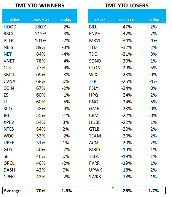 In TMT, YTD Losers outperformed winners by 350bps, a massive spread but for perspective the winners vs. losers spread is close to +100% this year: