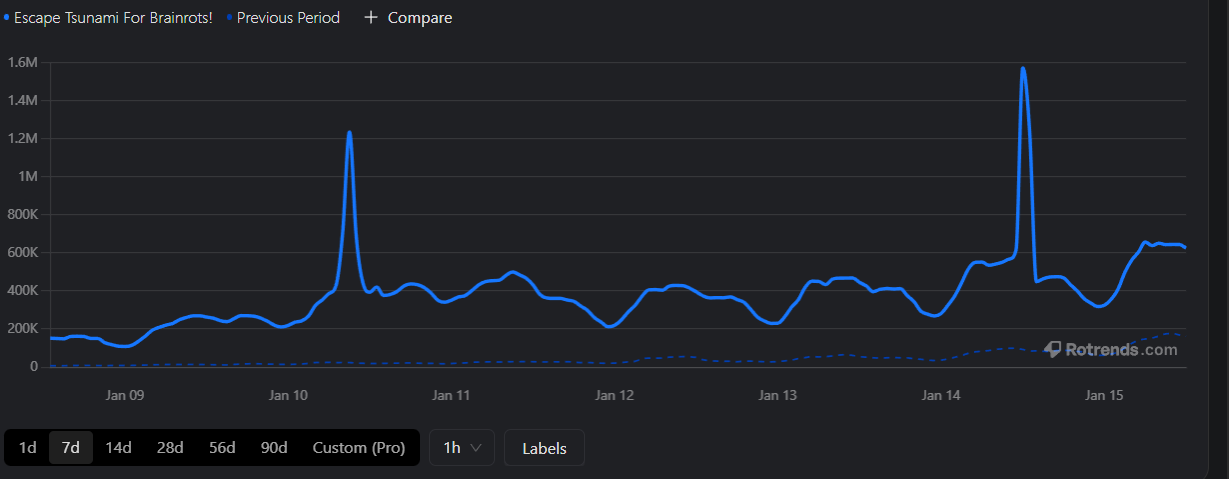 RBLX +2% as Escape from Tsunami continues to ramp in the charts (w/w about +300%)