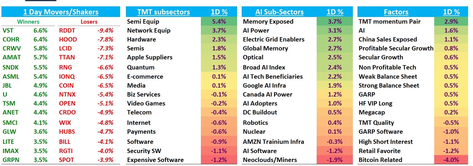 Broad AI risk on most of the day after TSM. Internet, payments, and software sold off, extending the semi vs. software rotation as investor conversations continue to focus on 2 key aspects of the AI trade: Claude Code and OpenAI. Factor-wise, TMT momentum, AI, and China-exposed tech worked, while quality and GARP underperformed. On the downside, high short interest, retail favorites, and crypto-linked names were hit hardest, with Bitcoin-related exposure notably weak on a Senate banking bill that felt hawkish for COIN/HOOD/CRCL (more detail below).