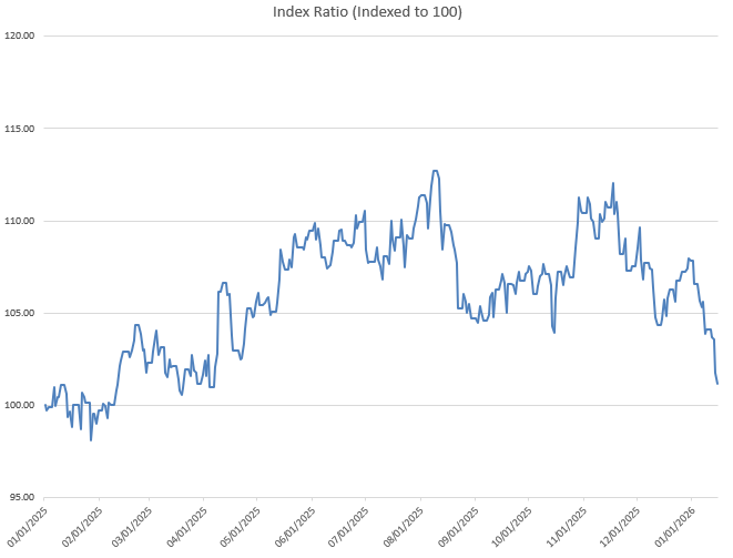 Good afternoon. QQQs +36bps as market struggled to find its footing outside of AI semis following TSM’s great print. IWM again outperformed QQQs, this time by about 50bps and has outperformed almost every day this new year with the ratio down ~6% YTD