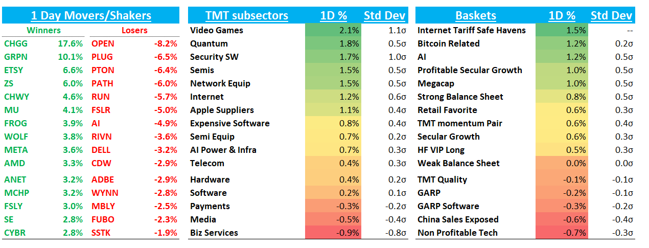 GOOGL -1.6% as reports that Samsung is replacing Gemini with Perplexity in most devices. GS was out positive as well saying YouTube is worth ~$475B and Google Cloud ~$710B, implying the Search & Other segment is currently trading at just ~5.3x FY26E EBIT…next big datapoint is Yipit data on Friday which will encompass 3 weeks and likely will set the tone going into the end of the q