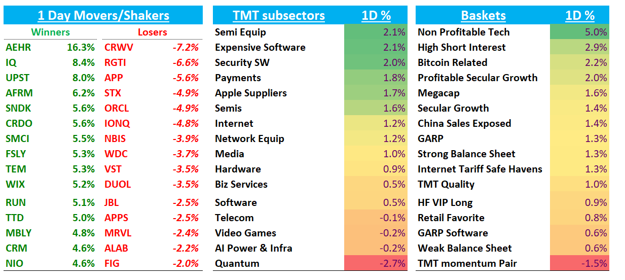 Good afternoon. QQQs +1.3% on a day where large cap (ex NVDA) led the way higher as AAPL +4% hit new all time highs for the first time since late 2024. Factor dispersion continues as Non-profitable tech/high short interest led the way higher while TMT Mo sold off.