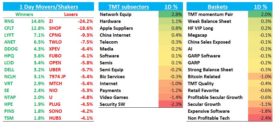 Good afternoon - QQQs finished flat on the day. Beats continue to be rewarded while misses are getting hit - seems like pretty rationale px action to us. However, some good price action in large cap as I’m seeing a pattern of consensus longs crawling back EPS losses: see META, NFLX (now at same px before EPS), and DDOG nice move today following move down yesterday. Will UBER be next? Overall, px action dovetails with upward trending choppy market type action. Momentum outperformed on the day while non-profitable tech was the big loser.