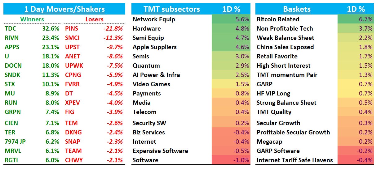 The sentiment doesn’t seem to be seeping into stocks yet, however, although we’re seeing more discrimination in terms of stock picking within AI: investors are preferring certain areas which continue to outperform. Current favorites: memory/HDDs (pricing skyrocketing/most upside to NT numbers), power/DCs (biggest bottleneck/potential for deals), TPUs ramping (CLS, AVGO, LITE). Just look at the price action today with BE +10%, MU +9%; SNDK +12%; STX +11%; WDC +5%; CLS +5%; LITE 25%; VRT 5% leading AI names higher. Next catalysts on the AI docket are AMD 11/11 Analyst day, NVDA’s print on 11/18, and the RBC Conference on 11/19 where investors expect MU to pre-announce.