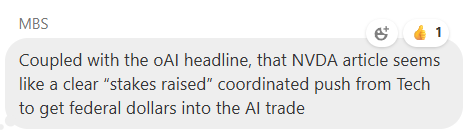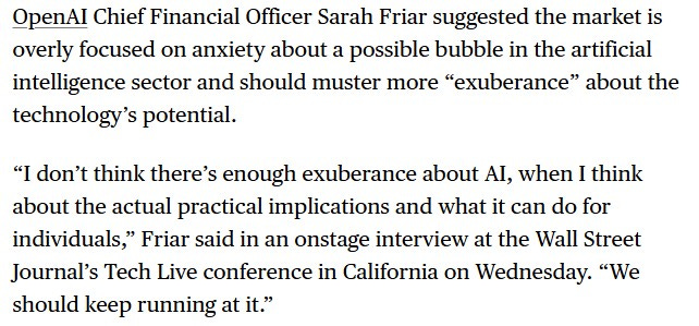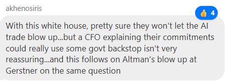 Friar isn’t the type of CFO to randomly talk about something — my guess is discussions are taking place with the US Gov and this is a PR effort to begin to sway opinion. Would the US Gov pull the trigger with stocks at highs or wait until a swoon in AI stocks to step in?