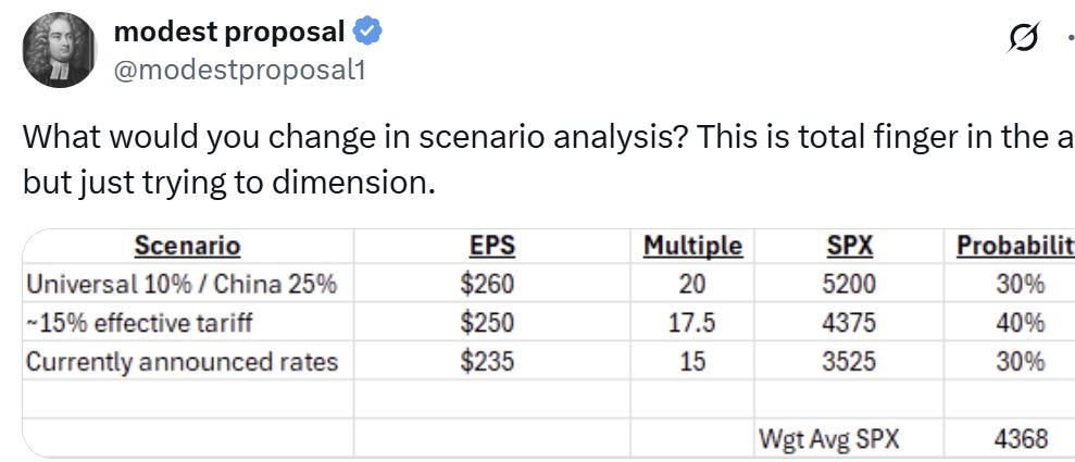 QQQs +24bps with a nice comeback after futures were down close to 5% last night at one point and one of the largest intraday ranges (8%+) since Covid. China dropped 8%. Yields were up 10-20bps across the curve, a big surprise to many - some worries here around higher inflation and a worsening fiscal backdrop + potential for reduced trade deficits to curb demand for U.S. financial assets. Markets continue to price in close to 4 fed cuts this year, down from 4-5 cuts at the beginning of the day. Why the rally? Well didn’t take much to bounce from such oversold levels, especially after VIX crossed 45. News flow continues to point to Trump staying the course although there seems to be more rhetoric around negotiations (ex-China). So far, the narrative/price action seems to squarely point to China-exposed companies being the worst off as most other countries likely to strike some sort of deal (even EU at some point). Good quick back of envelope math below — not saying #s are right, but plug in whatever you see fit…
