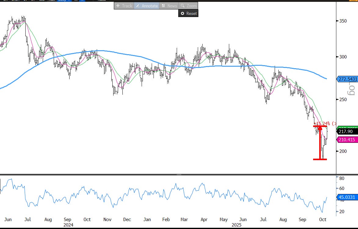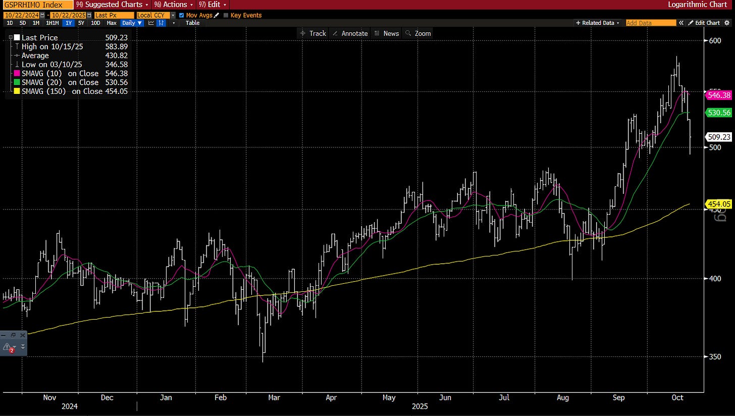Adding fuel to the fire are the macro cross-currents: — an ongoing gov’t shutdown. Trump vs. China, regional bank weakness, and subprime concerns. And we haven’t even mentioned the factor see-saw which has been paining L/S HFs all month long: one day its retail shorts outperforming, the next day is cyclical shorts, another day beta net an issue, another day AI winners, and so on. This has all caused the beginning of some de-leveraging among HFs until things settle down a bit.