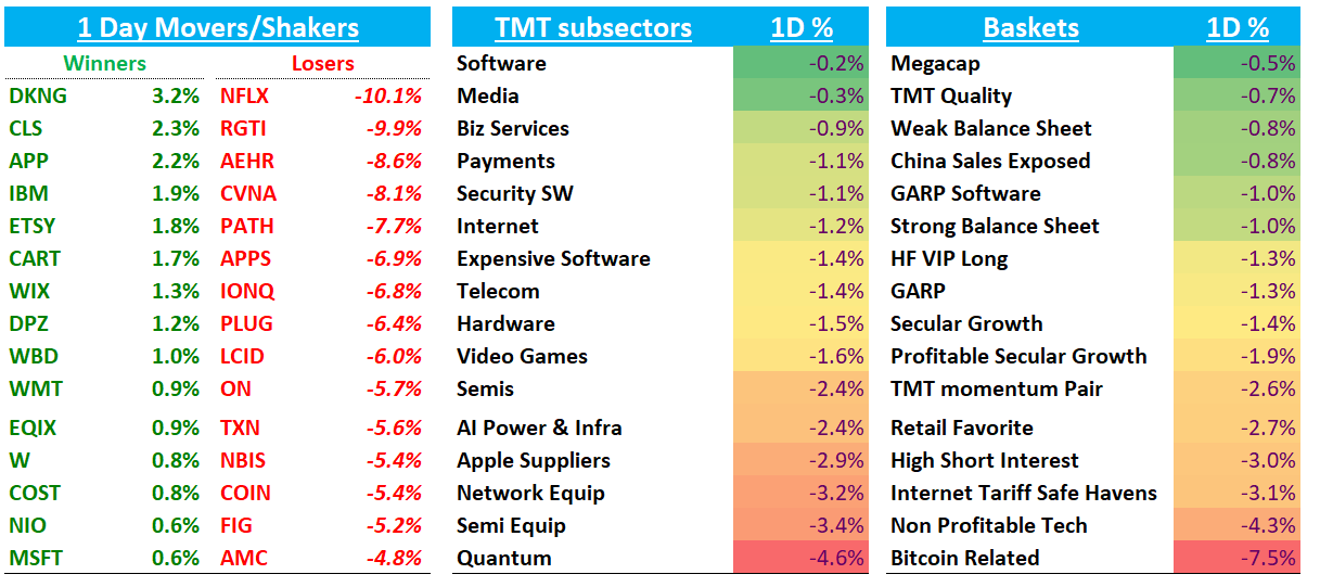 We thought the set up entering today was primed for possible strength in AI names as you had a bevy of good news: APH/GEV/VRT results were all strong; Anthropic + GOOGL deal; APLD signing $5B deal with a hyperscaler, the DoC supporting foreign purchases of AI; and AMZN/AAPL/NFLX/Analog weakness all potentially helping flows into AI.