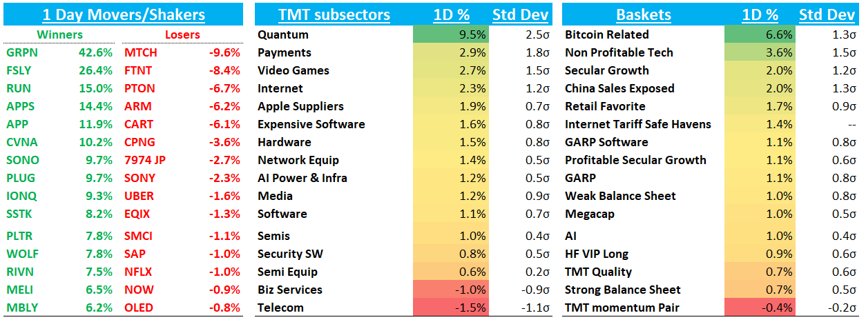 SHOP -20bps nice comeback after being down 8% after a mixed print where better GMV was offset by worse margins. The key for me was mgmt did a good job on the call alleviating some investor fears around China exposure saying only ~1 % of GMV is tied to Chinese imports losing de minimis treatment; cross-border flows are balanced US-inbound/outbound and predominantly intra-Europe, so tariff risk is “minimal for now.” This was investors main fears going into the print given consumer has generally been strong so that was a big relief. They also flagged continued ROI-positive marketing spend, an enterprise pipeline “as large as we’ve ever seen,” and flexibility to throttle spend if macro trends sour. Mgmt said April/early-May GMV trends remain strong >20 % y/y.