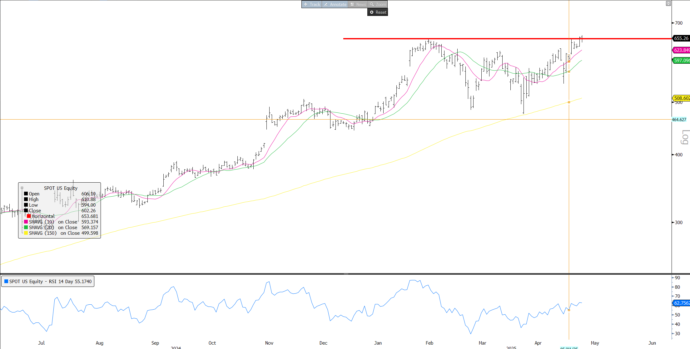 Watching a potential similar pattern with SPOT (break to new highs, then break back below resistance), with key $650 level. A break below that would give further confirmation that tariff safe haven trade taking a breather…(DASH, TTWO, RBLX similar looking charts…but NFLX and SPOT have been poster childs of the trade)…Remember this is the group that has led us higher from the bottom so a key tea leaf to watch — more worrisome for the market if it’s not coupled with strength in China/tariff names…