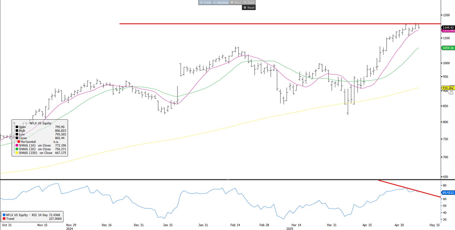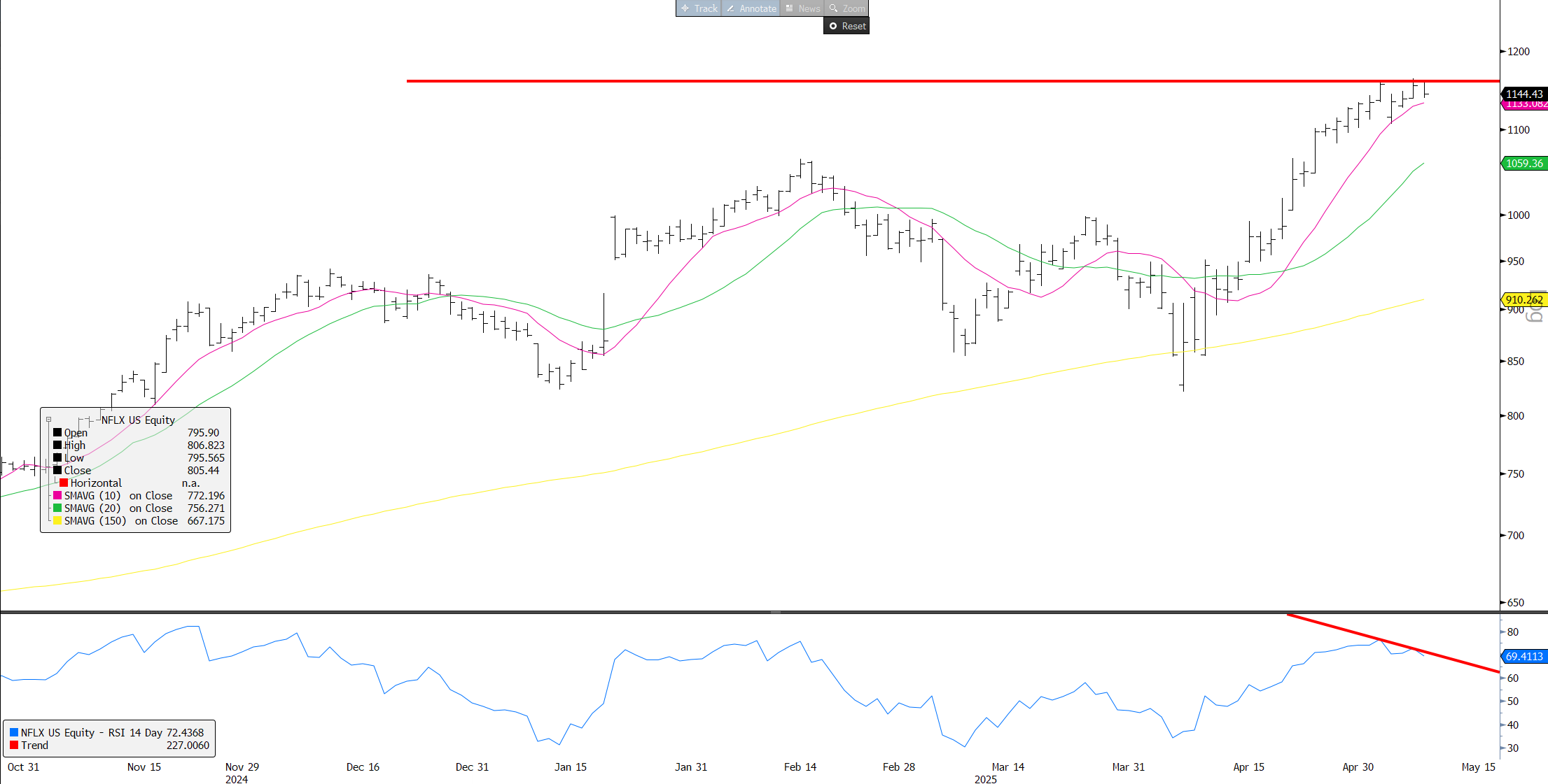 NFLX -1%: stock made a brief new high then dipping back below resistance on neg RSI divergence.