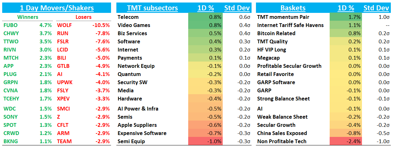 QQQs +10bps with a nice bounce back following early morning weakness as dips continue to get bought as investors continue to slowly gross up. Positioning still seems light. Here’s GS: “Our PB data still shows a significant underweight in the major U.S. tech names—though positioning has just begun to rebound from multi-year lows.” We keep it simple: stocks continue to act well and charts look good. Treasuries saw selling earlier on the Moody’s dg but bounced back and yields only finished down 1-3 bps across the curve. BTC +1.4% getting close to ATHs…