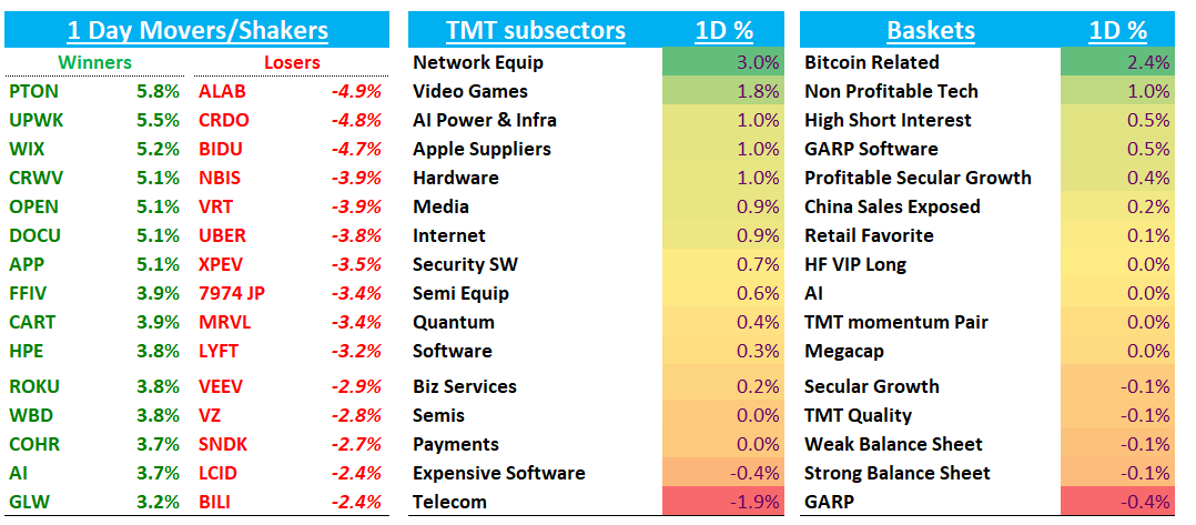 Sector/Factor breakdown: Network equipment led subsectors (+3.0%), helped by solid follow-through in enterprise and optical names, while AI power & infrastructure (+1.0%) also gained (GEV will help tomorrow here too). The SOX ended flat, masking dispersion within semis, while telecom (-1.9%) and expensive software (-0.4%) lagged. On a factor basis, value and short momentum factors outperforming — TMT Value Long rose +1.0% and S Momentum +0.8% — some mean-reversion after a strong run in long-duration and high-beta growth.