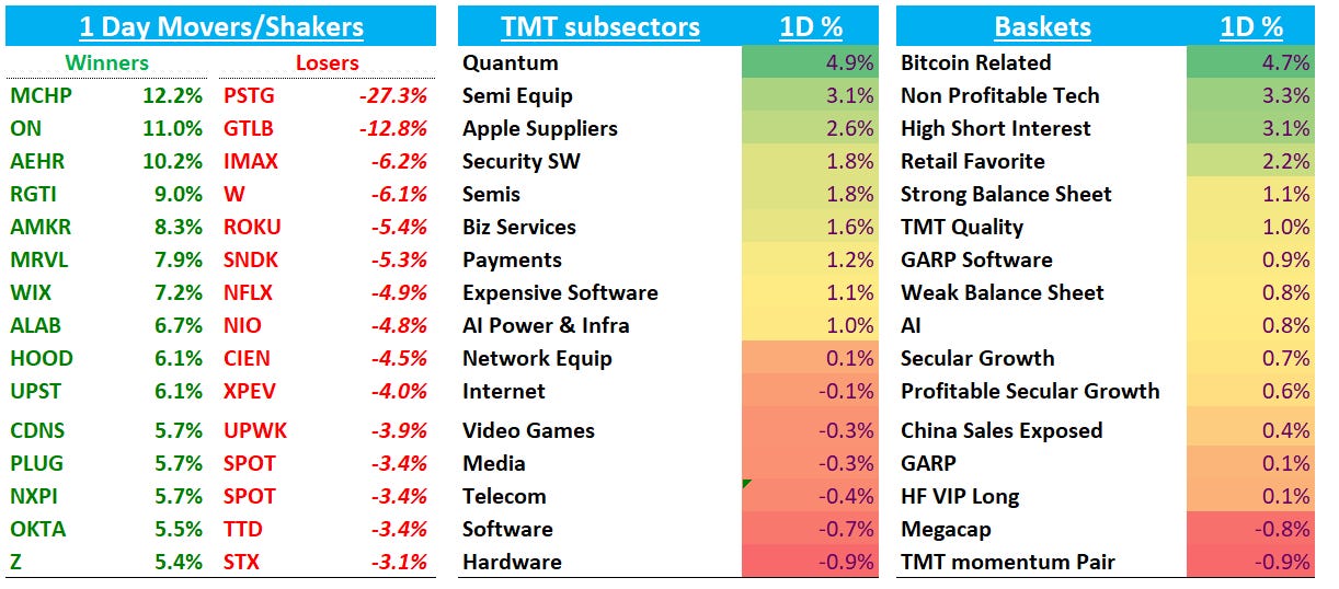 Stocks sold off but rallied to recover all losses despite MSFT -2.5% not recovering at all. BTC +4% caught a bid as well, helping High Short Interest (+4.0%) and Non-Profitable Tech (+3.3%) outperform. Semiconductors were the standout (+2%), but like yesterday leadership shifted away from the usual AI darlings to cyclical/industrial names. MCHP ripped +12.2% after raising its quarterly guidance, citing strong bookings and backlog. This dragged other analog/industrial peers higher, with ON +11% and NXPI +5.7%, who also sounded good at UBS yesterday. The Semi Equipment subsector also showed continued strength, up 3.1%.