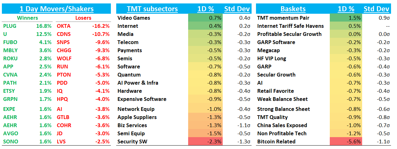 RDDT +70bps; New Street had a note out today after meeting with RDDT’s mgmt team last week. New Street said while the rollout of AI Overviews is expected to weigh on logged-out DAUs, management is focused on diversifying traffic sources and leaning into Reddit’s strength as a platform for trusted, human-centered content. The firm notes growing traction in Reddit’s ad business, particularly in mid-funnel performance, and sees upside to ad ARPU even as user traffic moderates. Importantly, New Street mentioned Reddit is building out end-to-end automation tools for advertisers and progressing toward Dynamic Product Ads, which just exited beta. New Street cut logged-out DAU estimates but raised ARPU, with no change to overall revenue or EBITDA forecasts.