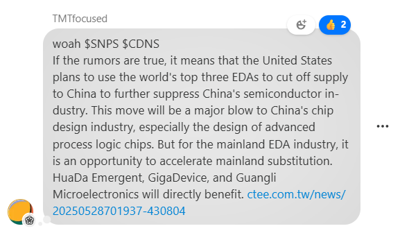 Wonderful heads up by TMTfocused in the chat, posting the below in the morning with CDNS/SNPS only down 1.5% and about 4 hours before FT caught the headline. Kudos — this is TMTB Chat at its best…