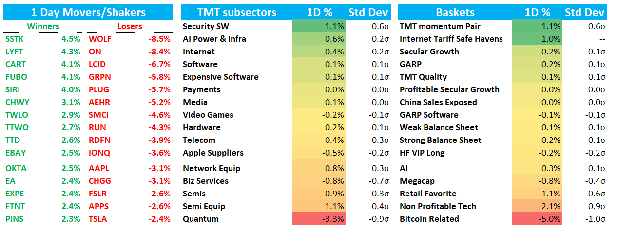 NFLX -2%: Stock initially sold off 5% initially on Trump’s tweet that he would tariff all foreign made movies 100%. The administration then backed off - not surprisingly given the tweet left many unanswered questions. THR: “Although no final decisions on foreign film tariffs have been made, the administration is exploring all options to deliver on President Trump’s directive to safeguard our country’s national and economic security while Making Hollywood Great Again,” White House spokesman Kush Desai tells The Hollywood Reporter.