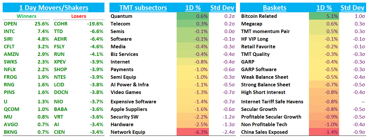 Good afternoon. QQQs were roughly flat with IWM -1.3% underperforming. After the hot PPI, yields rose 5-6bps across the curve and fed expects shifted in a hawkish direction with only ~90% odds of a rate cut in Sept (down from 100% pre PPI) and 55bps of total cuts from remaining 3 meetings. After a couple of days of rotation to more cyclically exposed names, tech investors moved back to Mega-cap, which outperformed non-profitable tech by 150bps today. BTC with a false breakout finishing down 4% on the day after touching new highs.