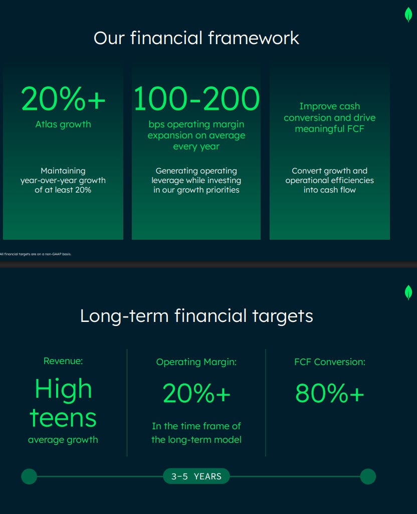 MDB -3.5% as CFO did his best to thread the needle between managing MDB’s existing guidance framework vs putting out LT targets by giving a 3-5 year guide (20%+ Atlas) and said guide wasn’t a ceiling, implying there was plenty of upside (supposedly CFO implied as much). Next q’s number likely going to be 30%+. Bulls say the LT framework finally sets a credible floor on growth/profitability, LOs are underweight a 20% grower at scale, and Atlas could print high-20s/30% near term; AMP should help productize demand and capture app-modernization, making the targets look sandbagged and leaving the stock biased higher into the next print. Bears say the stock is +50% since FQ2 while guidance implies high-teens total growth, modest EBIT expansion, and teens FCF margins, leaving little room for multiple expansion if Atlas decelerates; FCF < EBIT (pay-as-you-go mix, low deferred rev) still invites skepticism, and the slides lacked an “uber-bull” case. Most sw investors still skew long here.