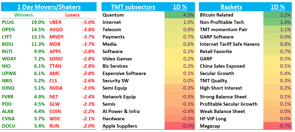 NVDA -2.4% on more negative Chian headlines, this time the FT saying that China has banned China tech companies from buying NVDA’s AI chips, specifically the RTX Pro 6000D. Unclear if this will extend to H20/B30 or if it’s a negotiating tactic by the Chinese gov’t but only time will tell. China is clearly a massive opportunity for NVDA and shipping there would make numbers go up - it’s unclear how much buyside explicitly has modeled — I think there’s still hope that some sort approval will get done, but no one has a clear answer and we’ve gotten incremental negative news flow on that front over the last week so that’s where we sit currently. AMD -1% in sympathy