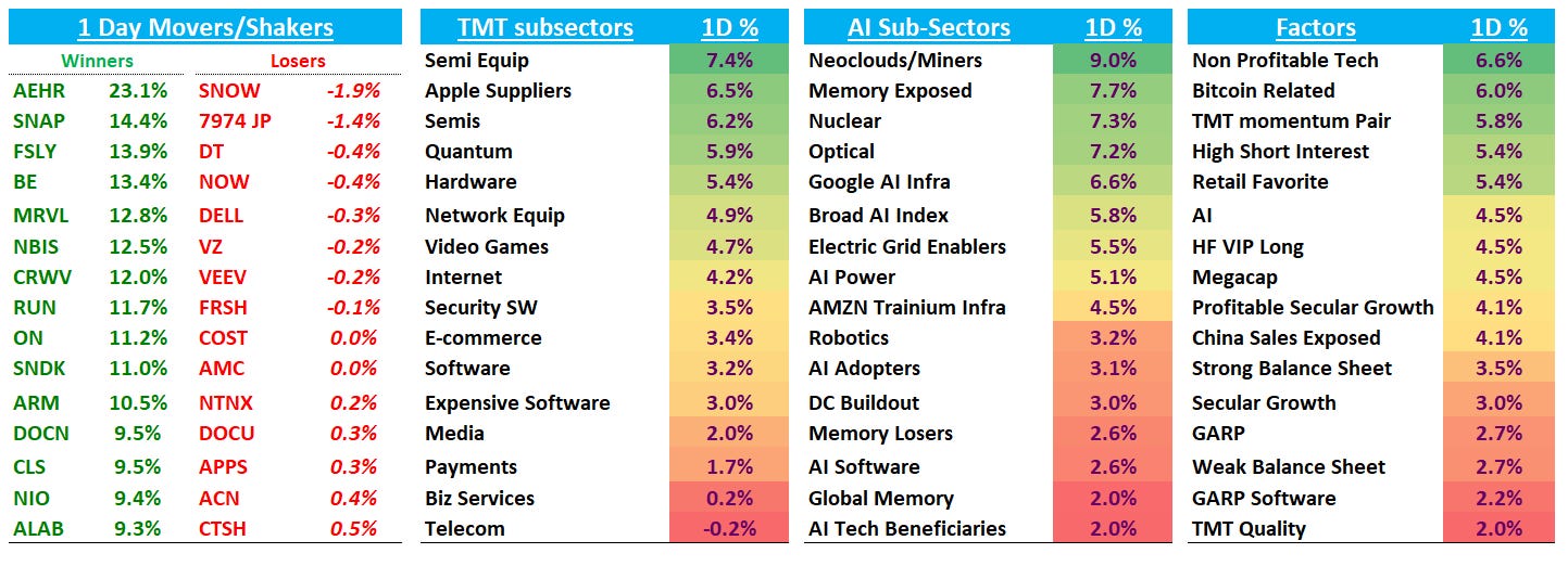 MRVL +11% as they announced a partnership with NVDA to connect MRVL to the NVDA AI Factor and AI-RAN ecosystem through NVIDIA NVLink Fusion as well as a $2Bn investment from NVDA. Harlan At JPM (one of main bulls on the stock) was out saying they view today's expanded NVDA-MRVL partnership is a broadening collaboration into silicon photonics and AI-RAN for 5G/6G, and confirming MRVL as the primary NVLink Fusion integration partner for AWS's Trainium4. Harlan basically arguing this signals Nvidia is "effectively acknowledging custom ASIC XPUs are here to stay" and that the optimal strategic response is embedding its interconnect, networking, and CPU stack into XPU racks rather than defending GPU-only deployments. Just a couple ppts off 52wk highs — who would have thought MRVL could be first AI semi to break out to new highs. Not involved here, but chart looks nice: