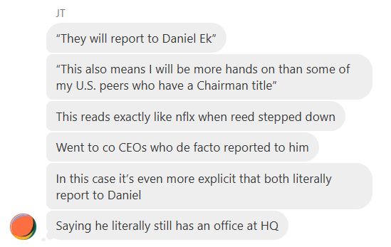 SPOT -4% after Ek announced he was moving to a Chairman role and GS downgraded on mainly valuation. Sounds like Ek will still be very involved int he company:
