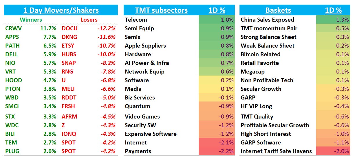 Outside of AI semis, saw a lot of unwind-y action in internet and software as $’s continues to flow into the former, with some big down moves in HUBS -10% and DOCU -10% as OpenAI posted several videos overnight that some took as a competitive threat: