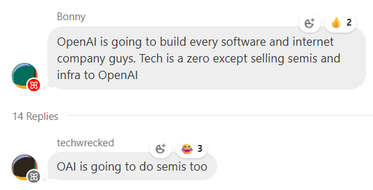 Sw investors continue to remain skittish around any sort of perceived disintermediation. We liked this cheeky comment from a TMTB reader describing OpenAI’s pace of product roll outs: