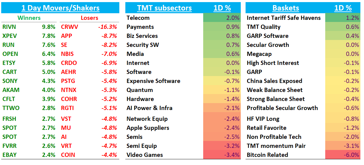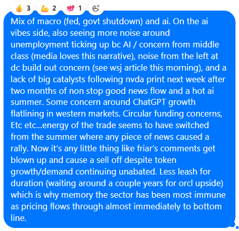 QQQs -27bps. Laggards led the way vs. winners today - not only in Tech as the AI trade continues to take a breather but also in the broader market with Healthcare and Energy leading the way higher. Lots of noise around AI trade but most tech investors I talk to think it’s just typical ebb and flow in the trade we’ve seen over the past 2-3 years. Some off the cuff thoughts from us in the chat today about what’s been happening…