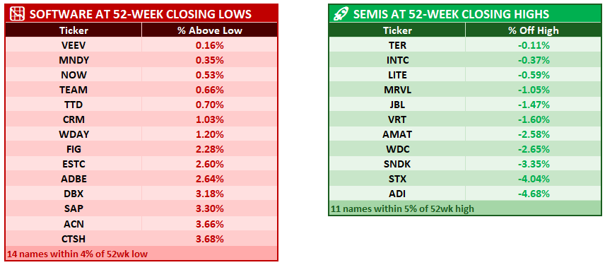 Didn’t see one semi stock red on my screen while software was mainly a sea of red outside just a few names. IGV is now down 24% on the year while Semis are up 11% overall (and that’s with NVDA lagging), a whopping 35% spread. Overall ,the semis vs software ratio is hitting new lows;