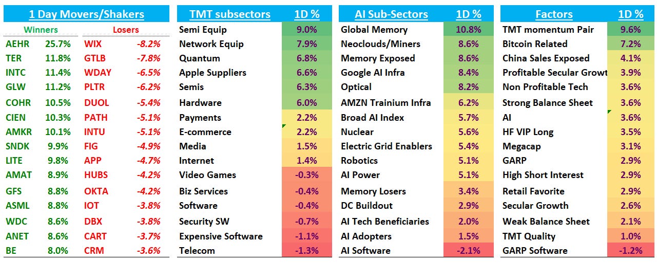 TMT Mo pair up 10%, one of its biggest gains in years. The AI trade vibes even managed to infiltrate the hyperscalers today as well: META +6.5% (see below for more detail); GOOGL +3.9%; AMZN +3.5%. Felt like the good ol days (oh wait, NVDA still underperforming…one step at a time…)
