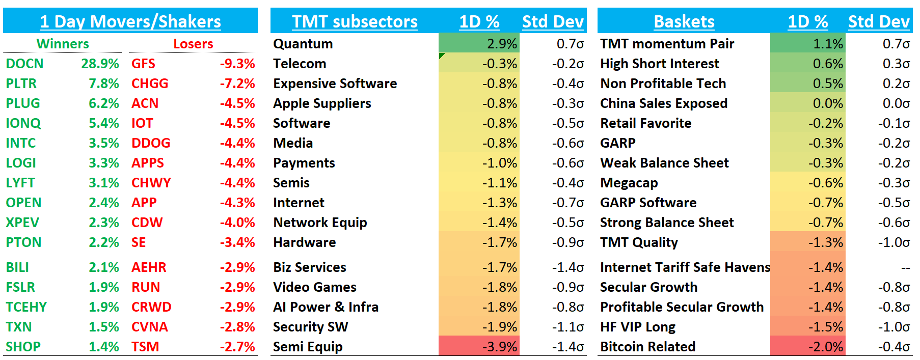 ALAB +8%: Another strong beat and raise. Some leaned short heading into the print and #s slightly ahead of buyside. 2Q revenue/gross margin/EPS of $192m/76.0%/$0.44 vs. Street at $173m/74.1%/$0.32….3Q guide for revenue/gross margin/EPS of $206.5m/75%/$0.385 vs. Street at $181m/73.6%/$0.34