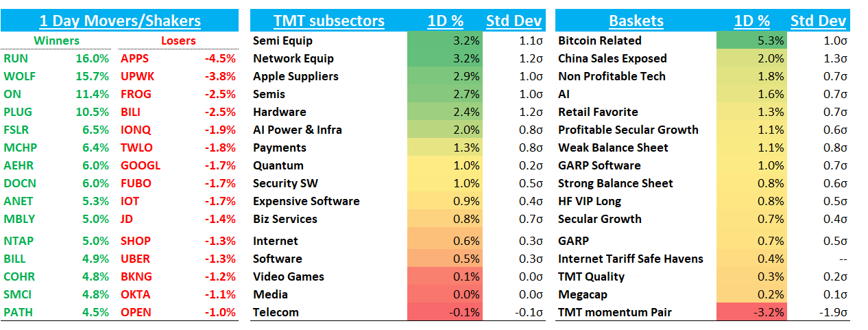 Good evening. Risk on continues as QQQs +80bps led by semis: both AI semis AND Analogs. AI semis helped by some bullish NVDA notes, bullish TSM CEO commentary, and META’s deal with CEG as we head into AVGO’s earnings on Thursday and AMD/ANET/NVDA Paris AI days next week. In analogs, ON CEO sounded good at BAML and analogs strong following through on MCHP’s positive pre-announcement last week.