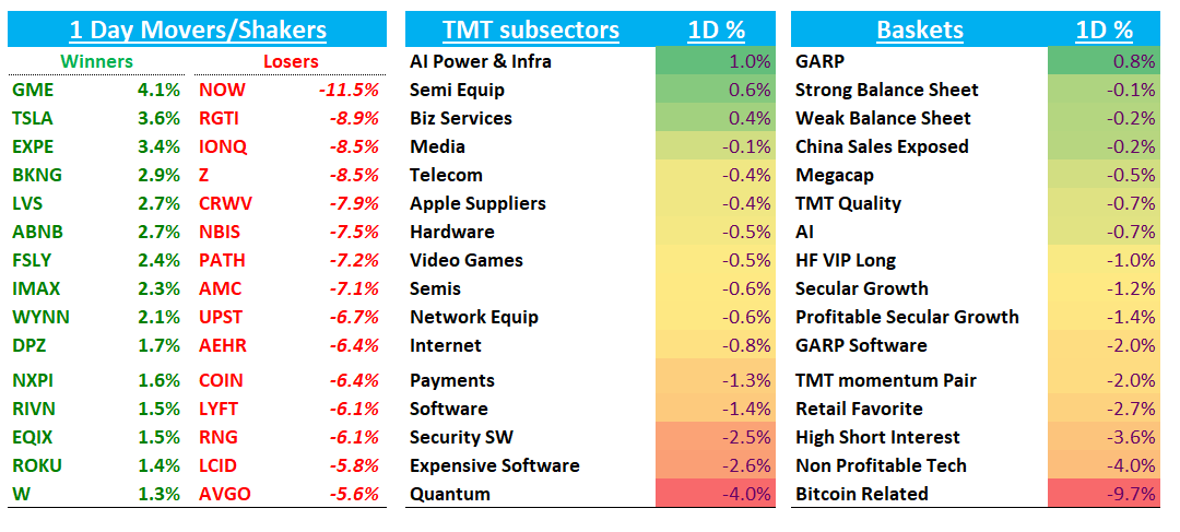 Tech felt risk-off and fragmented: high beat/spec led the way lower: Quantum -4%, Non-profitable Tech -4%, and High interest short baskets -3.5%. Mega Cap /GARP factors outperformed. In Sw, Security SW (-2.5%) / Expensive SW (-2.6%) led the way lower with NOW -11.5% the main drag after their Armis acquisition. Semis were only mildly weak with the SOX -0.6% helped by NVDA +75bps and analog names while some of the spec names fell MSD (BE -6%; NBIS/CRWV -8%, ARM -5%) as price action overall still didn’t feel great. It’s been a bit tougher than normal finding a clear bigger picture pattern of what and why things are working on any given day over the last few weeks and a low liquidity environment the week before Christmas won’t help things.