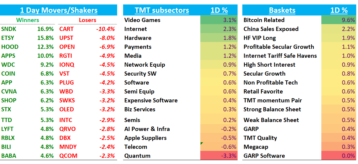 RBLX +5% on the EA takeout read-through as it remains one of the few remaining public video assets along with TTWO. Yip was also out saying Aug bookings accelerated to 50% vs. July…The RoTrends data continues to hold up very well with 99 Nighs and Steal a brainrot helping offset slowing GAG growth, and we have our eye on Plants vs Brainrots which reached 3M CCUs last weekend…continue to like this one as we head into what should be a big Q3.
