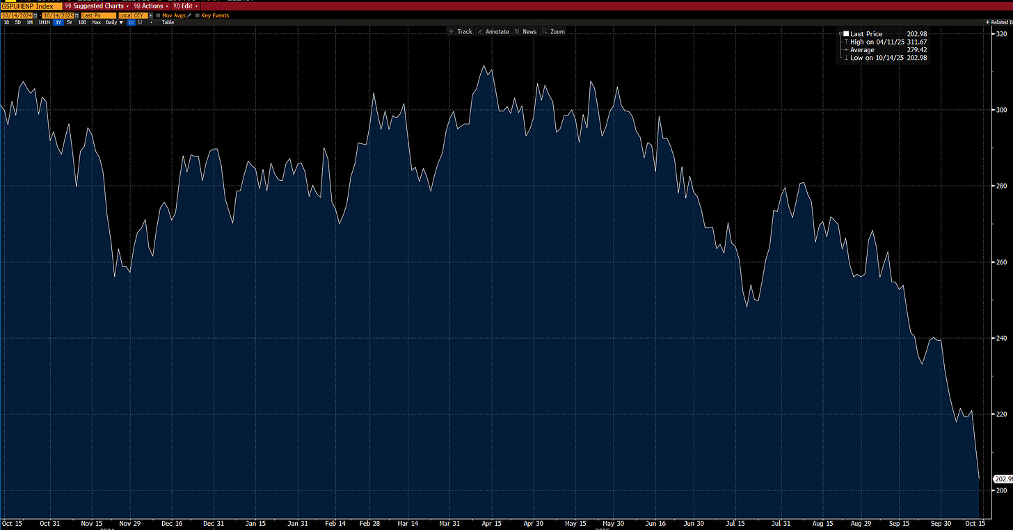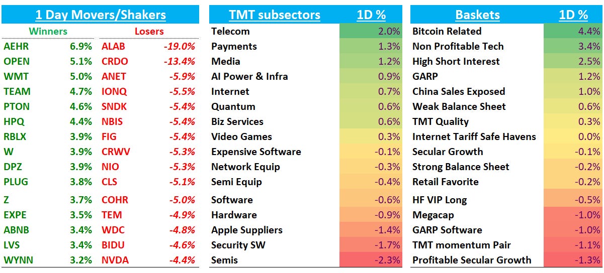 In Tech semis led the way down as AI names were noticeably weaker. Non-profitable/highly shorted names outperformed while momentum was down. US Megacap cap vs. Non profitable Tech down another 4% today and now down 15% MTD — shows how large cap (especially in Internet where the narratives are facing some headwinds over the last few weeks) has been used as a source of funds recently: