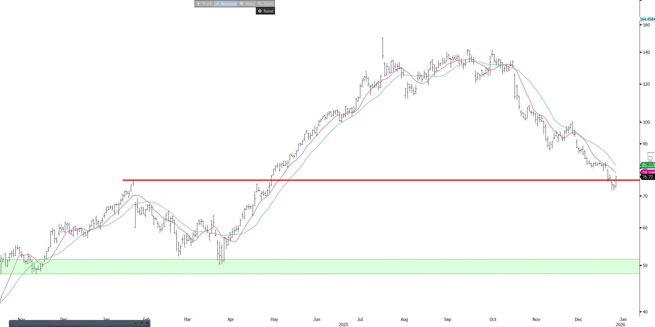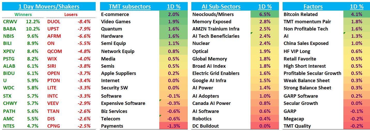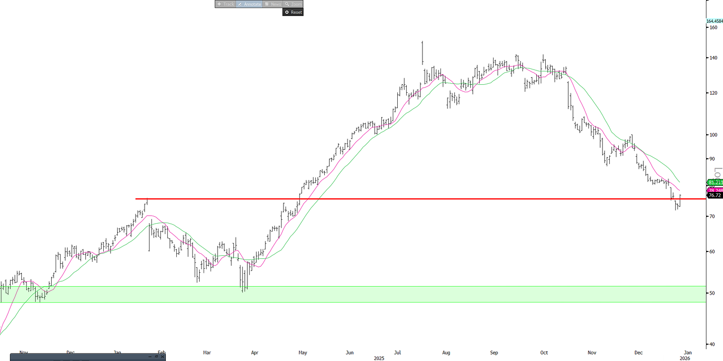 RBLX +5% didn’t hear anything here or see any significant inflection in the data but sentiment had reached a nadir (tough ‘26 comps, GTA VI competition, Dec data slowing) so maybe just some covering today. High level, RBLX should benefit from better coding models as they can enable a massive influx of non-professional creators to build sophisticated, high-quality games that were previously impossible for them to make, which all flows through at near zero-marginal cost other than the fees paid out to developers. In theory this should massively increase the flywheel. Interesting spot on the chart as well as it dipped below previous resistance and now bounced back above it (“false breakdown”). Would like to get more positive here (we still like all the longer term drivers we were bullish on when we were long the stock last year), but its a HF/data heavy stock and the narrative there just makes it tough for us to get excited.